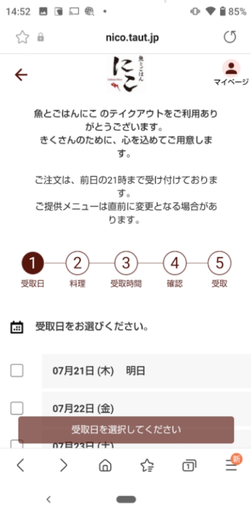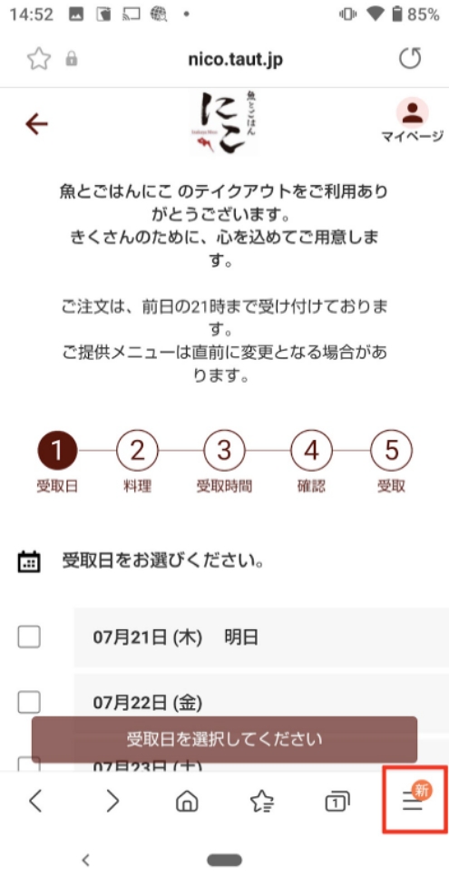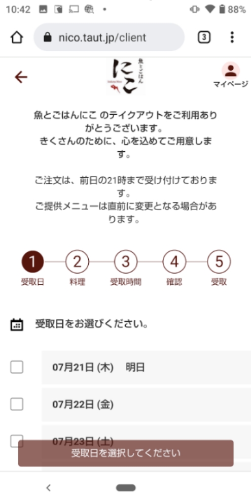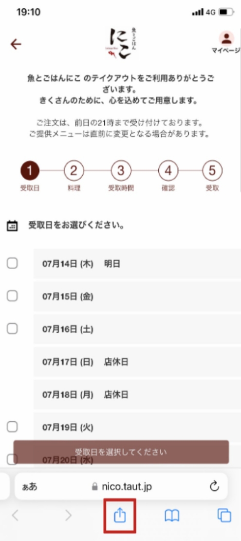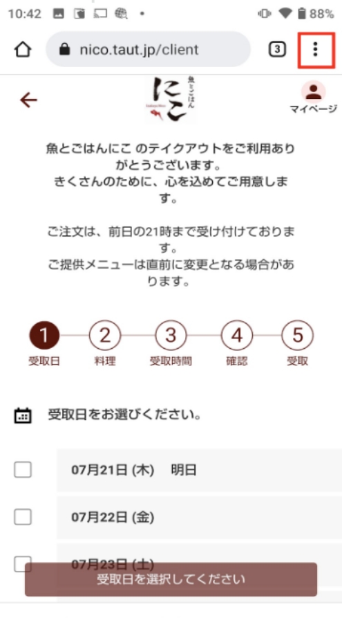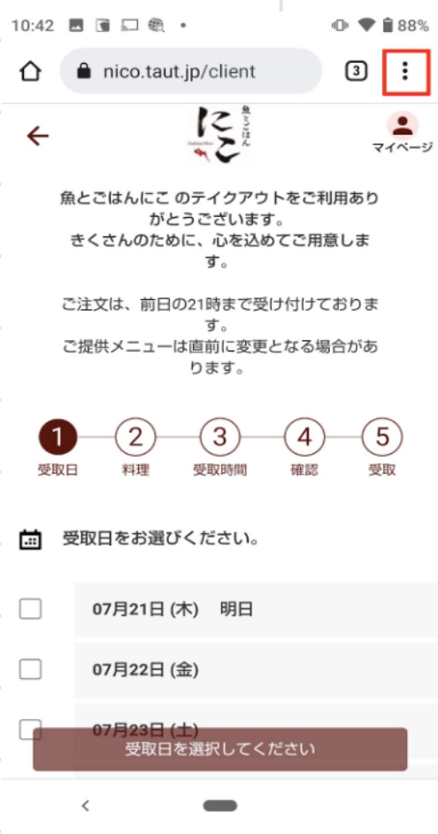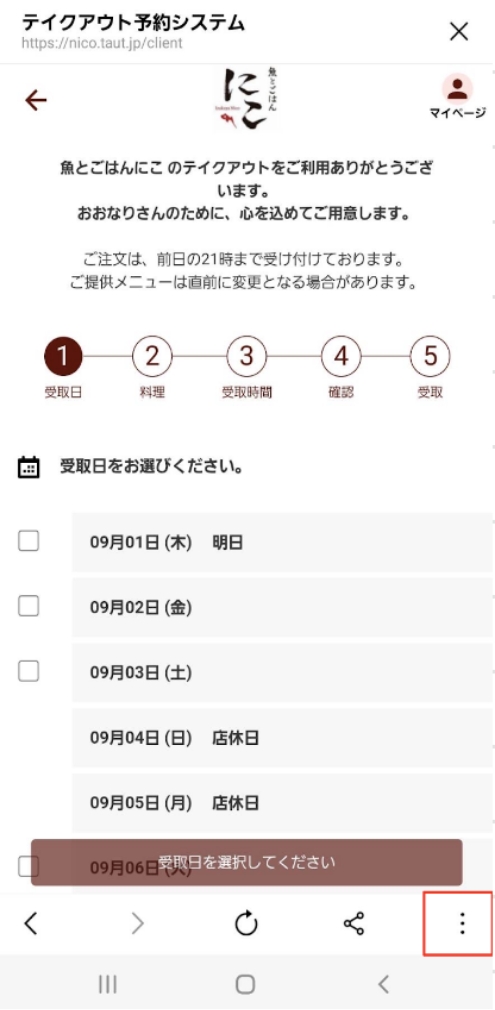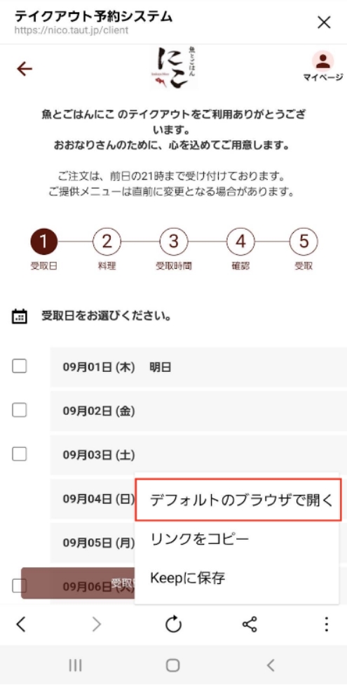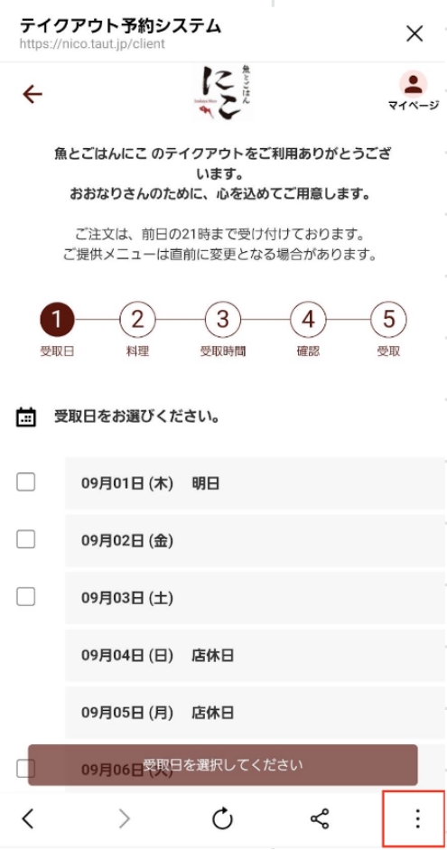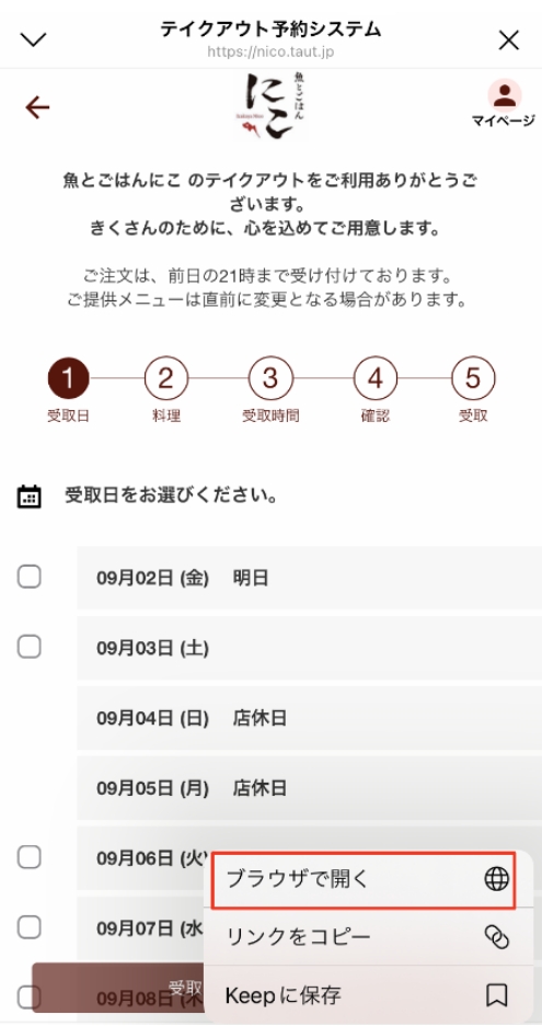 2.テイクアウト予約のページを表示 テイクアウト予約ページ:https://wacchoy-ism.taut.jp/